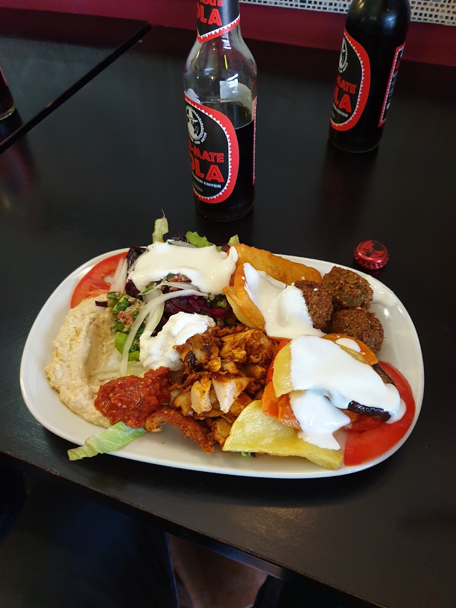 Dig into their incredibly flavorful falafels, freshly made to order, that boast a delightful contrast of crunchy exterior and soft, succulent interior. A crowd favorite is the vegetarian platter, which comes artfully arranged with grilled vegetables, smooth labneh, fresh salad, creamy hummus, and a spicy chili sauce, all served alongside warm, fluffy flatbreads. At around €6, this feast is not only mouthwateringly good but also an immense value for your money.